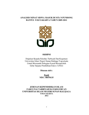 PARDI, NIM. 08470135 (2012) ANALISIS MINAT SISWA MASUK DI MTs N PUNDONG BANTUL YOGYAKARTA TAHUN 2009-2011. Skripsi thesis, PERPUSTAKAAN UIN SUNAN KALIJAGA.