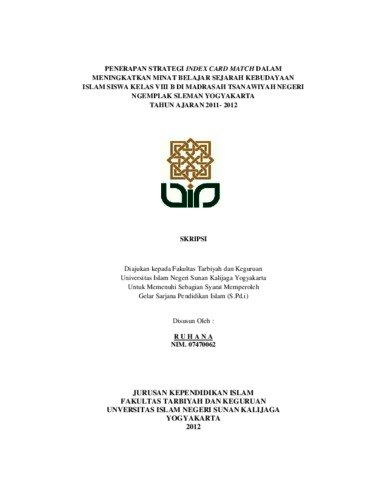 RUHANA, NIM. 07470062 (2012) PENERAPAN STRATEGI INDEX CARD MATCH DALAM MENINGKATKAN MINAT BELAJAR SEJARAH KEBUDAYAAN ISLAM SISWA KELAS VIII B DI MADRASAH TSANAWIYAH NEGERI NGEMPLAK SLEMAN YOGYAKARTA TAHUN AJARAN 2011- 2012. Skripsi thesis, PERPUSTAKAAN UIN SUNAN KALIJAGA.