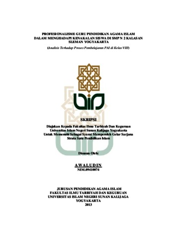 AWALUDIN, NIM.09410074 (2013) PROFESIONALISME GURU PENDIDIKAN AGAMA ISLAM DALAM MENGHADAPI KENAKALAN SISWA DI SMP N 2 KALASAN SLEMAN YOGYAKARTA (Analisis Terhadap Proses Pembelajaran PAI di Kelas VIII). Skripsi thesis, UIN SUNAN KALIJAGA.