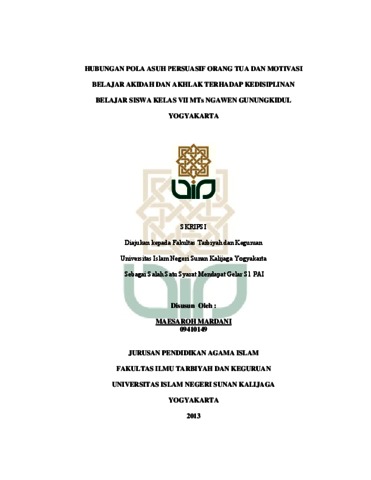 MAESAROH MARDANI, NIM. 09410149 (2013) HUBUNGAN POLA ASUH ORANG TUA DAN MOTIVASI BELAJAR AKIDAH DAN AKHLAK TERHADAP KEDISIPLINAN BELAJAR SISWA KELAS VII MTs NGAWEN GUNUNGKIDUL YOGYAKARTA. Skripsi thesis, UIN SUNAN KALIJAGA.