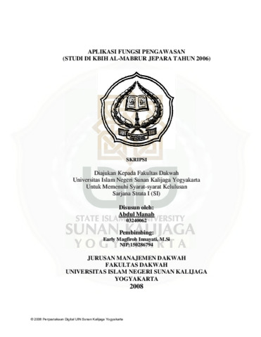 Abdul Manab, NIM.: 03240062 (2008) APLIKASI FUNGSI PENGAWASAN (STUDI DI KBIH AL-MABRUR JEPARA TAHUN 2006). Skripsi thesis, UIN SUNAN KALIJAGA YOGYAKARTA.