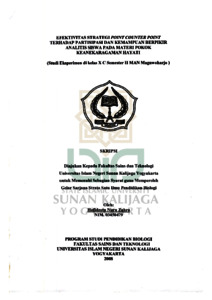 Penelitian ini bertujuan untuk mengetahui apakah penggunaan strategi Point Counter Point lebih efektif daripada pembelajaran konvensional dalam rangka meningkatkan partisipasi dan kemampuan berpikir analitis siswa pada sub pokok bahasan pengaruh kegiatan manusia terhadap keanekaragaman hayati di kelas X C Semester II MAN Maguwoharjo Sleman. Penelitian ini dilakukan untuk membandingkan seberapa efektifkah penggunaan strategi Point Counter Point dibandingkan pembelajaran konvensional dilihat dari hasil pretes dan postes kedua kelompok serta seberapa besar partisipasi siswa selama proses pembelajaran berlangsung pada kedua kelompok. Desain penelitian yang digunakan adalah Quasi Eksperiment (Eksperimen semu). Populasi penelitian adalah semua siswa kelas X MAN Maguwoharjo Sleman, dan diambil sampel 2 kelas atas dasar penunjukan sekolah (guru bidang studi) dan pertimbangan peneliti yaitu kelas X C sebagai kelas eksperimen dan kelas X B sebagai kelas kontrol. Pengumpulan data dilakukan dengan menggunakan lembar soal pretes dan postes, serta lembar observasi. Analisis data untuk partisipasi siswa selama pembelajaran baik pembelajaran dengan strategi Point Counter Point maupun pembelajaran konvensional dilakukan dengan menggunakan analisis deskriptif. Analisis data untuk soal tes (pretes dan postes) menggunakan uji t data berpasangan. Sebelum dilakukan uji t terlebih dahulu dilakukan uji prasarat yaitu uji normalitas sebaran uji homogenitas varians. Hasil analisis partisipasi selama proses pembelajaran Biologi menunjukkan bahwa 83,4% siswa tergolong pada kategori cukup baik dan baik untuk kelas eksperimen, sedangkan kelas kontrol 60% pada kategori kurang baik. Hasil analisis uji prasarat menunjukkan data berdistribusi normal dan memiliki varians yang homogen. Hasil analisis untuk uji t data berpasangan menunjukkan bahwa thit 5,20 ttab 2,689 yang artinya : tidak terdapat perbedaan yang signifikan dari penggunaan strategi Point Counter Point terhadap kemampuan berpikir analitis siswa selama proses pembelajaran Biologi di kelas.