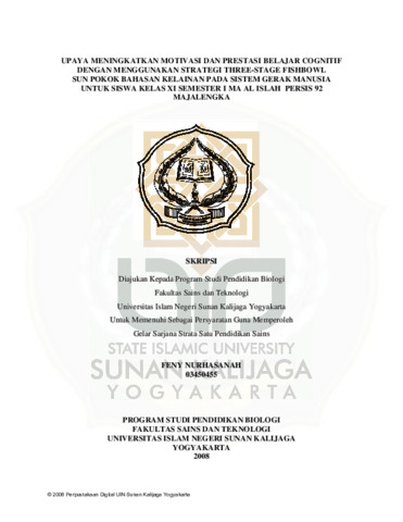 Feny Nurhasanah, NIM.: 03450455 (2008) UPAYA MENINGKATKAN MOTIVASI DAN PRESTASI BELAJAR COGNITIF DENGAN MENGGUNAKAN STRATEGI THREE-STAGE FISHBOWL SUN POKOK BAHASAN KELAINAN PADA SISTEM GERAK MANUSIA UNTUK SISWA KELAS XI SEMESTER I MA AL ISLAH PERSIS 92 MAJALENGKA. Skripsi thesis, UIN SUNAN KALIJAGA YOGYAKARTA.
