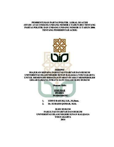 ISMUHAR, NIM. 09340031 (2014) PEMBENTUKAN PARTAI POLITIK LOKAL DI ACEH (STUDI ATAS UNDANG UNDANG NOMOR 2 TAHUN 2011 TENTANG PARTAI POLITIK DAN UNDANG UNDANG NOMOR 11 TAHUN 2006 TENTANG PEMERINTAH ACEH). Skripsi thesis, UNIVERSITAS ISLAM NEGERI SUNAN KALIJAGA.