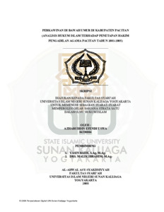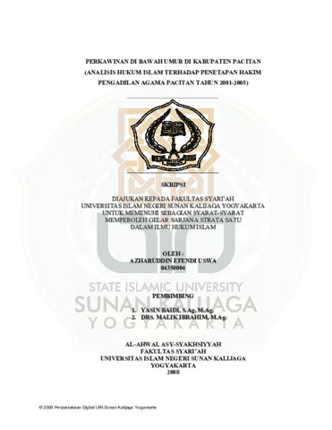 Azharuddin Efendi Uswa, NIM.: 04350004 (2008) PERKAWINAN DI BAWAH UMUR DI KABUPATEN PACITAN (ANALISIS HUKUM ISLAM TERHADAP PENETAPAN HAKIM PENGADILAN AGAMA PACITAN TAHUN 2001-2005). Skripsi thesis, UIN SUNAN KALIJAGA YOGYAKARTA.