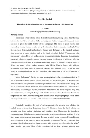 AL MAKIN, SUNAN KALIJAGA ISLAMIC STATE UNIVERSITY (2012) PLURALITY DENIED: THE DEFEAT OF PLURALISM ADVOCATES IN INDONESIA DURING THE REFORMATION ERA. PRESENTED AT THE CONFERENCE OF NEGOTIATING DIVERSITY IN INDONESIA, SCHOOL OF SOCIAL SCIENCES, MANAGEMENT UNIVERSITY, SINGAPORE, NOVEMBER 5-6, 2012..