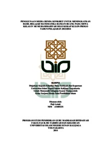 Penggunaan Media Benda Konkret Untuk Meningkatkan Hasil Belajar Matematika Materi Bangun Ruang Pada Siswa Kelas IV MI Muhammadiyah Selo Kecamatan Kokap Kabupaten Kulon Progo Tahun Pelajaran 2013/2014”, Skripsi. Yogyakarta : Fakultas Ilmu tarbiyah dan Keguruan UIN Sunan Kalijaga, 2014. Berhasil atau gagalnya pencapaian tujuan pendidikan amat tergantung pada proses belajar yang dialami oleh siswa .Terkait dengan upaya peningkatan kualitas belajar tersebut khususnya pada mata pelajaran matematika materi bangun ruang, salah satu tawaran yang harus dikembangkan oleh guru adalah bagaimana guru bisa menggunakan media sebagai bahan integral dalam proses pembelajaran dengan sebaik-baiknya. Dengan kata lain, seorang guru harus bisa memanfaatkan benda di sekitar sebagai media dalam kegiatan belajar mengajar meskipun program sekolah sudah terencana dengan baik. Selama ini satu-satunya media yang dominan digunakan guru adalah buku paket. Sedangkan metode pembelajaran yang digunakan guru adalah metode ceramah dengan sedikit tanya jawab. Metode pembelajaran yang seperti itu cenderung monoton dan membosankan yang akhirnya akan berpengaruh pada melemahnya antusiasme siswa dalam mengikuti pembelajaran. Hal ini akhirnya berdampak pada hasil belajar siswa yang rendah.Untuk mengatasi permasalahan tersebut maka hal yang perlu dilakukan adalah menggunakan media benda konkret sehingga pembelajaran akan lebih menarik, menjadi konkrit, mudah dipahami, hemat waktu dan tenaga, dan pembelajaran lebih bermakna. Dengan begitu diharapkan hasil belajar siswa meningkat. Permasalahan yang dikaji dalam penelitian ini adalah: (1) bagaimana penggunaan media benda konkret pada pembelajaran matematika bangun ruang di kelas IV MI Muhammadiyah Selo Kokap Semester II tahun pelajaran 2013/2014, (2) bagaimana hasil belajar matematika materi bangun ruang siswa kelas IV MI Muhammadiyah Selo Kokap Semester II Tahun Pelajaran 2013/2014 setelah menggunakan media benda konkret dalam pembelajaran. Penelitian ini merupakan penelitian tindakan ( action research), karena penelitian ini dilakukan untuk memecahkan masalah pembelajaran di kelas. Penelitian ini terdiri Pendahuluan (Pra Siklus) dan Langkah Tindakan Kelas (Siklus). Adapun langkah PTK ini terdiri dari dua siklus yang masing-masing siklus meliputi Perencanaan (Planning), Pelaksanaan (Acting), Observasi (Observation) dan Refleksi (Reflection). Data yang diambil dalam penelitian ini meliputi: keaktifan siswa yang diambil dari hasil pengamatan observer yang diberikan pada tiap siklus, hasil belajar siswa yang diperoleh dari pemberian soal tes pada setiap akhir siklus, , wawancara dengan kepala madrasah dan gurudan, aktivitas guru yang diambil dari lembar observasi guru dokumentasi. Indikator dari hasil keberhasilan dalam penelitian ini adalah : (1) mampu menyelesaikan soal dengan benar, (2) mampu menyampaikan jawaban secara lisan, (3) mampu melaksanakan rangkaian kegiatan pembelajaran, (4) mampu merespon materi yang diberikan.Hasil belajar siswa mencapai KKM yaitu 70. viii Hasil penelitian penggunaan media benda konkret pada pembelajaran matematika materi bangun ruang dilakukan dengan cara mengenalkan bangun ruang dan unsur-unsurnya menggunakan model bangun ruang pejal, model bangun ruang berongga dan model kerangka bangun ruang. Sedangkan untuk memudahkan pemahaman siswa tentang jaring-jaring bangun ruang dapat menggunakan kemasan-kemasan yang berbentuk bangun ruang ruang, seperti kemasan pasta gigi, kemasan obat, kemasan alat kecantikan dan lain-lain. Kemasan-kemasan tersebut digunting menurut jaring-jaringnya. Hasil penelitian ini menunjukkan peningkatan hasil belajar siswa. Peningkatan nilai rata-rata hasil belajar siswa pada Pra Siklus hanya sebesar 60,45. Nilai itu meningkat menjadi sebesar 72,73 pada Siklus I, dan meningkat lagi pada Siklus II menjadi 92,73. Peningkatan nilai rata-rata ini diikuti juga dengan peningkatan prosentase pencapaian KKM. Sebelum pelaksanaan siklus perbaikan (Pra Siklus) siswa yang tuntas hanya 4 (36%) siswa, setelah perbaikan Siklus I meningkat menjadi 7 (64%) siswa dan pada siklus terakhir yaitu siklus II jumlah siswa yang tuntas meningkat menjadi 11(100%).