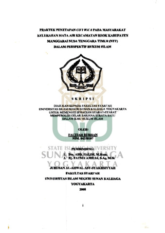 Fauziah Burhan, NIM.: 04350107 (2008) PRAKTEK PENETAPAN CO`I WA`A PADA MASYARAKAT KELURAHAN MATA AIR KECAMATAN REOK KABUPATEN MANGGARAI NUSA TENGGARA TIMUR (NTT) DALAM PERSPEKTIF HUKUM ISLAM. Skripsi thesis, UIN SUNAN KALIJAGA YOGYAKARTA.
