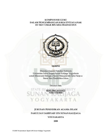 Rini Dwi Jayanti, NIM.: 03410088 (2008) KOMPETENSI GURU DALAM PENGEMBANGAN KREATIVITAS ANAK DI TKIT UMAR BIN KHATHAB KUDUS. Skripsi thesis, UIN SUNAN KALIJAGA YOGYAKARTA.