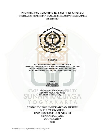 Hilmi Arif, NIM.: 02361664 (2008) PENDEKATAN SAINTIFIK DALAM HUKUM ISLAM ( STUDI ATAS PEMIKIRAN FAZLUR RAHMAN DAN MUHAMMAD SYAHRUR). Skripsi thesis, UIN SUNAN KALIJAGA YOGYAKARTA.