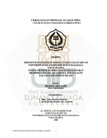 Husnul Mutaqin, NIM.: 04350108/03 (2008) CERAI GUGAT DENGAN ALASAN ZINA ( STUDI PUTUSAN NO.831/PDT.G/2006/PA.PWR ). Skripsi thesis, UIN SUNAN KALIJAGA YOGYAKARTA.