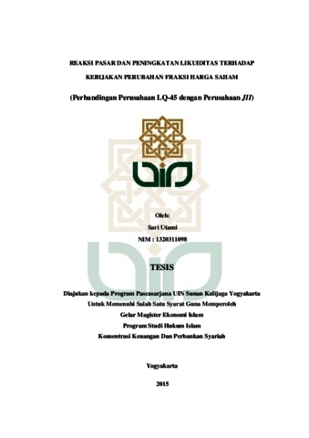 SARI UTAMI, NIM 1320311098 (2015) REAKSI PASAR DAN PENINGKATAN LIKUIDITAS TERHADAP KEBIJAKAN PERUBAHAN FRAKSI HARGA SAHAM (Perbandingan Perusahaan LQ-45 dengan Perusahaan JII). Masters thesis, UIN SUNAN KALIJAGA.