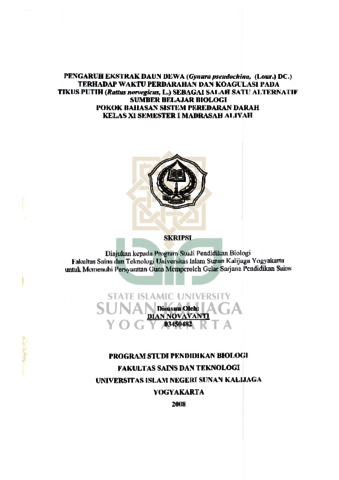 Dian Novayanti, NIM.: 03450482 (2008) PENGARUH EKSTRAK DAUN DEWA (Gynura pseudochina, (Lour.) DC.) TERHADAP WAKTU PERDARAHAN DAN KOAGULASI PADA TIKUS PUTIH (Rattus norvegicus, L.) SEBAGAI SALAH SATU ALTERNATIF SUMBER BELAJAR BIOLOGI POKOK BAHASAN SISTEM PEREDARAN DARAH KELAS XI SEMESTER I MADRASAH ALIYAH. Skripsi thesis, UIN SUNAN KALIJAGA YOGYAKARTA.