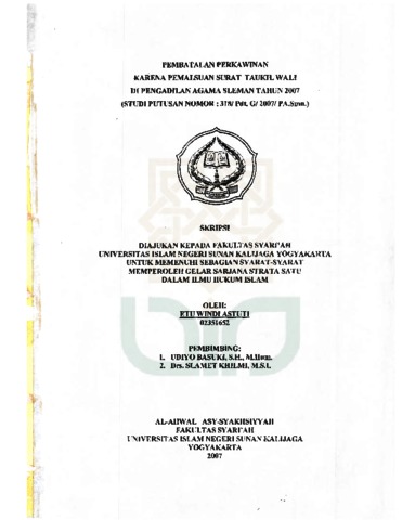 ETU WINDI ASTUTI, NIM. 02351652 (2007) PEMBATALAN PERKAWINAN KARENA PEMALSUAN SURAT TAUKIL WALI DI PENGADILAN AGAMA SLEMAN TAHUN 2007 (STUDI PUTUSAN NOMOR: 318/ Pdt. G/ 2007/ PA.Smn.). Skripsi thesis, UIN SUNAN KALIJAGA.