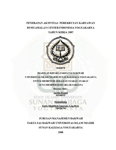 Sarida Hasmil, NIM.: 04240035 (2008) PENERAPAN AKTIVITAS PEREKRUTAN KARYAWAN DI MUAMALAT CENTER INDONESIA YOGYAKARTA TAHUN KERJA 2007. Skripsi thesis, UIN SUNAN KALIJAGA YOGYAKARTA.