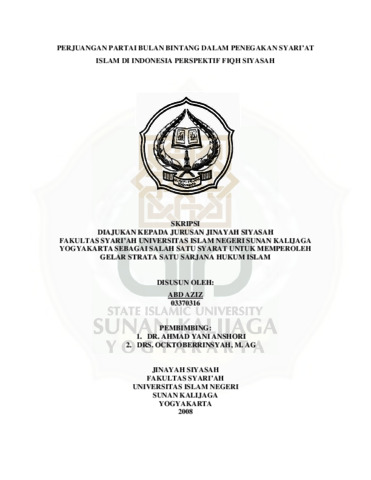 Abd. Aziz, NIM.: 03370316 (2008) PERJUANGAN PARTAI BULAN BINTANG DALAM PENEGAKAN SYARI’AT ISLAM DI INDONESIA PERSPEKTIF FIQH SIYASAH. Skripsi thesis, UIN SUNAN KALIJAGA YOGYAKARTA.