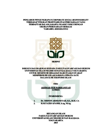 AKHMAD NUR HARDIANSYAH, NIM. 11390031 (2015) PENGARUH PENGUNGKAPAN CORPORATE SOCIAL RESPONSIBILITY TERHADAP TINGKAT PROFITABILITAS PERUSAHAAN YANG TERDAFTAR DALAM JAKARTA ISLAMIC INDEX DENGAN UKURAN PERUSAHAAN SEBAGAI VARIABEL MODERATING. Skripsi thesis, UIN SUNAN KALIJAGA YOGYAKARTA.