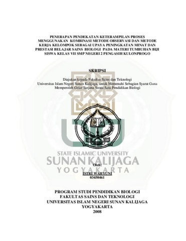 ISTRI WAHYUNI, NIM.: 03450461 (2009) PENERAPAN PENDEKATAN KETERAMPILAN PROSES MENGGUNAKAN KOMBINASI METODE OBSERVASI DAN METODE KERJA KELOMPOK SEBAGAI UPAYA PENINGKATAN MINAT DAN PRESTASI BELAJAR SAINS BIOLOGI PADA MATERI TUMBUHAN BIJI SISWA KELAS VII SMP NEGERI 2 PENGASIH KULONPROGO. Skripsi thesis, UIN Sunan Kalijaga Yogyakarta.