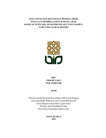 MIDI HS, SPDI, NIM. 1320412188 (2016) RISK TAKING DAN KECEMASAN PESERTA DIDIK PADA SAAT PEMBELAJARAN BAHASA ARAB DI KELAS XI IPA SMA MUHAMMADIYAH 5 YOGYAKARTA TAHUN PELAJARAN 2014/2015. Masters thesis, UIN SUNAN KALIJAGA YOGYAKARTA.