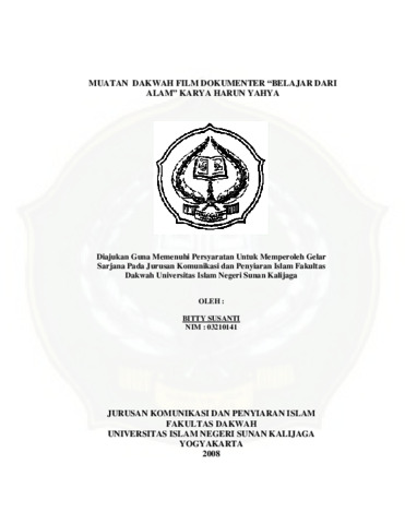 Bitty Susanti, NIM.: 03210141 (2008) MUATAN DAKWAH FILM DOKUMENTER "BELAJAR DARI ALAM" KARYA HARUN YAHYA. Skripsi thesis, UIN SUNAN KALIJAGA YOGYAKARTA.