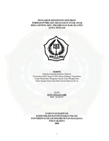 Etty Wulan Sari, NIM.: 01201827 (2008) PENGARUH MENONTON SINETRON TERHADAP PRILAKU KEAGAMAN ANAK-ANAK DESA GENENG KEC. PRAMBANAN KAB. KLATEN JAWA TENGAH. Skripsi thesis, UIN SUNAN KALIJAGA YOGYAKARTA.