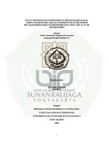 Nur Intan Hasibuan, NIM.: 04430982 (2009) UPAYA MENINGKATKAN KEMAMPUAN MENYELESAIKAN SOAL CERITA MATEMATIKA MELALUI PEMBENTUKAN KELOMPOK BELAJAR BERDASARKAN SOSIOMETRI PADA SISWA KELAS IV SD NEGERI PUREN. Skripsi thesis, UIN Sunan Kalijaga Yogyakarta.