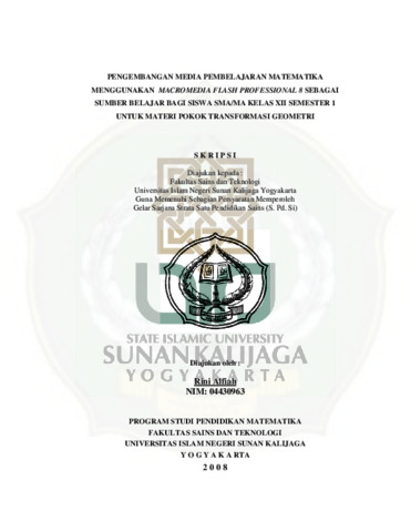 Rini Alfiah, NIM.: 04430963 (2008) PENGEMBANGAN MEDIA PEMBELAJARAN MATEMATIKA MENGGUNAKAN MACROMEDIA FLASH PROFESSIONAL 8 SEBAGAI SUMBER BELAJAR BAGI SISWA SMA/MA KELAS XII SEMESTER 1 UNTUK MATERI POKOK TRANSFORMASI GEOMETRI. Skripsi thesis, UIN Sunan Kalijaga Yogyakarta.