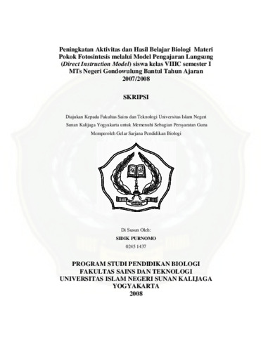 Sidik Purnomo, NIM: 02451437 (2008) PENINGKATAN AKTIVITAS DAN HASIL BELAJAR BIOLOGI MATERI POKOK AFOTOSINTESIS MELALUI MODEL PENGAJARAN LANGSUNG (DIRECT INSTRUCTION MODEL) SISWA KELAS VIIIC SEMESTER I MTS NEGERI GONDOWULUNG BANTUL TAHUN AJARAN 2007/2008. Skripsi thesis, UIN SUNAN KALIJAGA YOGYAKARTA.