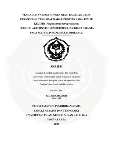 Siti Munawaroh, NIM.: 02441280 (2008) PENGARUH VARIASI KONSENTRASI RAGI DAN LAMA FERMENTASI TERHADAP KADAR PROTEIN PADA TEMPE KECIPIR (Psophocarpus tetragonolobus) SEBAGAI ALTERNATIF SUMBER BELAJAR KIMIA SMA/MA PADA MATERI POKOK MAKROMOLEKUL. Skripsi thesis, UIN SUNAN KALIJAGA YOGYAKARTA.