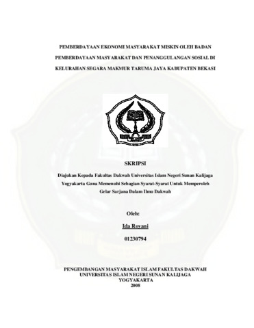 Ida Royani, NIM.: 01230794 (2008) PEMBERDAYAAN EKONOMI MASYARAKAT MISKIN OLEH BADAN PEMBERDAYAAN MASYARAKAT DAN PENANGGULANGAN SOSIAL DI KELURAHAN SEGARA MAKMUR TARUMA JAYA KABUPATEN BEKASI. Skripsi thesis, UIN SUNAN KALIJAGA YOGYAKARTA.