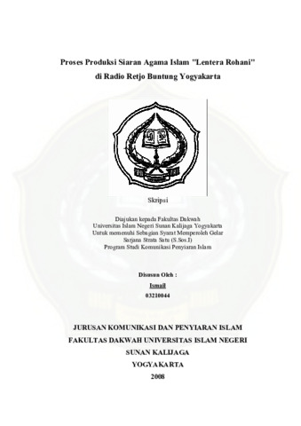 Ismail, NIM.: 03210044 (2008) PROSES PRODUKSI SIARAN AGAMA ISLAM "LENTERA ROHANI" DI RADIO RETJO BUNTUNG YOGYAKARTA. Skripsi thesis, UIN SUNAN KALIJAGA YOGYAKARTA.