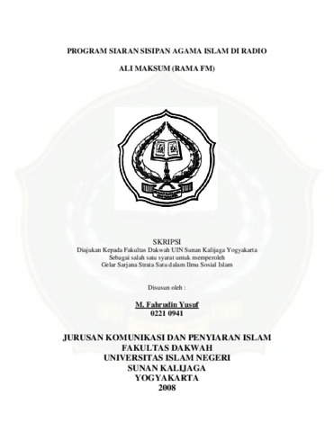 M. Fahrudin Yusuf, NIM.: 02210941 (2008) PROGRAM SIARAN SISIPAN AGAMA ISLAM DI RADIO ALI MAKSUM (RAMA FM). Skripsi thesis, UIN SUNAN KALIJAGA YOGYAKARTA.