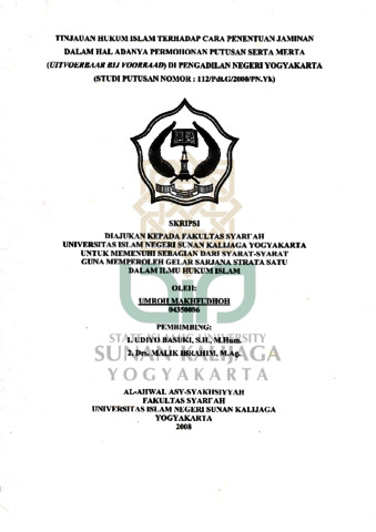 Umroh Makhfudhoh, NIM.: 04350086 (2008) TINJAUAN HUKUM ISLAM TERHADAP CARA PENENTUAN JAMINAN DALAM HAL ADANYA PERMOHONAN PUTUSAN SERTA MERTA (UITVOERBAAR BIJ VOORRAAD) DI PENGADILAN NEGERI YOGYAKARTA (STUDI PUTUSAN NOMOR : 112/Pdt.G/2000/PN.Yk). Skripsi thesis, UIN SUNAN KALIJAGA YOGYAKARTA.