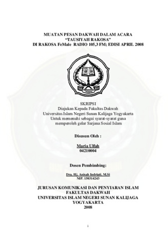 Maria Ulfah, NIM.: 04210004 (2008) MUATAN PESAN DAKWAH DALAM ACARA “TAUSIYAH RAKOSA” DI RAKOSA FeMale RADIO 105,3 FM; EDISI APRIL 2008. Skripsi thesis, UIN SUNAN KALIJAGA YOGYAKARTA.