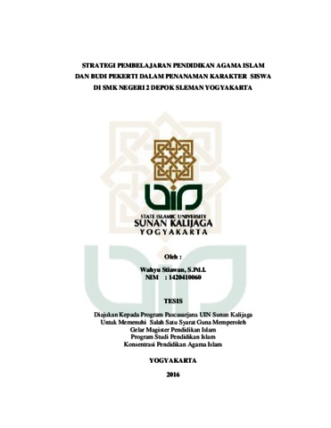 Wahyu Stiawan, 2016. Strategi Pembelajaran Pendidikan Agama Islam Dan Budi Pekerti Dalam Penanaman Karakter Siswa di SMK Negeri 2 Depok Sleman Yogyakarta, Tesis. Program Pascasarjana Dalam Konsentrasi Pendidikan Agama Islam Universitas Islam Negeri Sunan Kalijaga Yogyakarta. Latar belakang, berawal dari observasi dilapangan yakni di SMK Negeri 2 Depok Sleman Yogyakarta. di sana peneliti melihat, Budaya sekolah yang dikembangkan oleh SMK Negeri 2 Depok Sleman Yogyakarta sebagai bentuk pendidikan karakter untuk membangun karakter siswa diwujudkan dengan berbagai macam kegiatan melalui, pembiasaan-pembiasaan perilaku baik di dalam dan luar pelajaran di kelas dengan beberapa aktivitas, Kenakalan siswa juga terkadang terjadi disekolah yang mencerminkan siswa tidak memiliki karakter yang baik, seperti contoh: siswa terkadang masih ada yang suka berbohong, masih menyontek dalam melakukan ujian, tidak disiplin dan tidak saling menghargai satu sama lain. Semua itu dibutuhkan kesadaran dari siswa dan bimbingan dari guru, agar siswa berubah menjadi yang lebih baik lagi dan memiki karakter yang baik pula. Berdasarkan latar belakang di atas maka pokok permasalahan yang akan dibhas di sini adalah 1). Apa saja strategi pembelajaran pendidikan agama islam dan budi pekerti dalam penanaman karakter siswa di SMK Negeri 2 Depok Sleman Yogyakarta? 2). Bagaimana pelaksanaan strategi pembelajaran pendidikan agama islam dan budi pekerti dalam penanaman karakter siswa di SMK Negeri 2 Depok Sleman Yogyakarta? 3).Bagaimana hasil dari penerapan strategi pembelajaran pendidikan agama islam dan budi pekerti dalam penanaman karakter siswa di SMK Negeri 2 Depok Sleman Yogyakarta?. Metode penelitian ini merupakan penelitian Kualitatif, Jenis penelitian ini adalah penelitian lapangan (field research) yang bersifat diskriptif, peneliti menggunakan metode yaitu: Observasi, Wawancara, Dokumentasi. Sedangkan dalam menganalis data, peneliti menggunakan Reduksi data, Penyajian data dan Penarikan kesimpulan. Hasil penelitian yakni 1). Strategi yang digunakana adalah strategi pembelajaran langsung (Direct), strategi pembelajaran tidak langsung (Indirect), strategi pembelajaran interaktif (Interactive), strategi pembelajaran melalui pengalaman (experiental learning),dan strategi pembelajaran mandiri. 2) Pelaksanaan Strategi pembelajaran pendidikan agama islam dan budi pekerti dalam penanaman karakter siswa dengan memilih beberapa strategi yang telah disesuaikan dengan materi yang akan disampaikan, kemudian didukung dengan menggunakan beberapa metode pembelajaran dalam menyampaikan materi pembelajaran.3)Hasilnya adalah tercerminkan dari perilaku dan tindakan siswa berusaha untuk menjalankan dan mengaplikasikan pengetahuan karakter dalam kehidupan sehari-harinya.