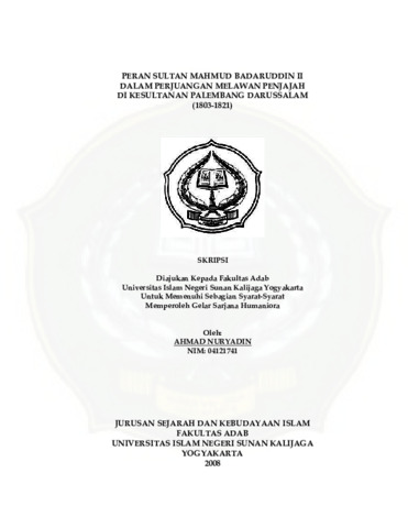 Ahmad Nuryadin, NIM.: 04121741 (2008) PERAN SULTAN MAHMUD BADARUDDIN II DALAM PERJUANGAN MELAWAN PENJAJAH DI KESULTANAN PALEMBANG DARUSSALAM (1803-1821). Skripsi thesis, UIN SUNAN KALIJAGA YOGYAKARTA.