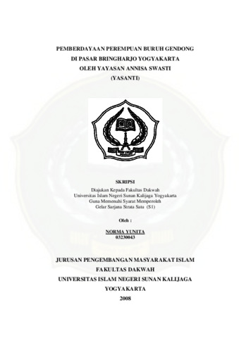 Norma Yunita, NIM.: 03230043 (2008) PEMBERDAYAAN PEREMPUAN BURUH GENDONG DI PASAR BRINGHARJO YOGYAKARTA OLEH YAYASAN ANNISA SWASTI (YASANTI). Skripsi thesis, UIN SUNAN KALIJAGA YOGYAKARTA.