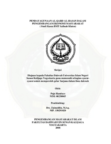 Pujo Handoyo, NIM.: 00230045 (2008) PENDAYAGUNAAN AL-QARD AL-HASAN DALAM PENGEMBANGAN EKONOMI MASYARAKAT (STUDI KASUS BMT SAFINAH KLATEN). Skripsi thesis, UIN SUNAN KALIJAGA YOGYAKARTA.