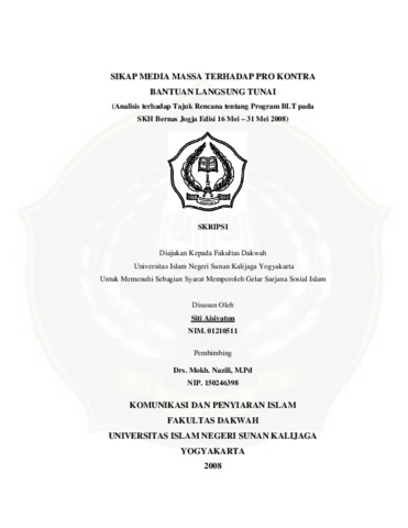 Siti Aisiyatun, NIM.: 01210511 (2008) SIKAP MEDIA MASSA TERHADAP PRO KONTRA BANTUAN LANGSUNG TUNAI (ANALISIS TERHADAP TAJUK RENCANA TENTANG PROGRAM BLT PADA SKH BERNAS JOGJA EDISI 16 MEI – 31 MEI 2008). Skripsi thesis, UIN SUNAN KALIJAGA YOGYAKARTA.