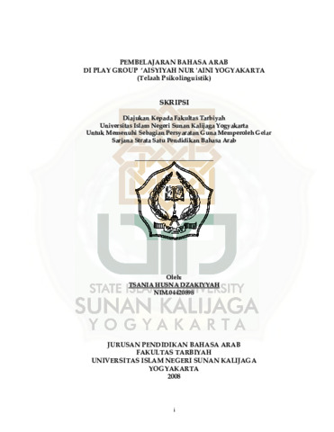 Tsania Husna Dzakiyyah, NIM.: 04420898 (2008) PEMBELAJARAN BAHASA ARAB DI PLAY GROUP AISYIYAH NUR 'AINI YOGYAKARTA (TELAAH PSIKOLINGUISTIK). Skripsi thesis, UIN SUNAN KALIJAGA YOGYAKARTA.