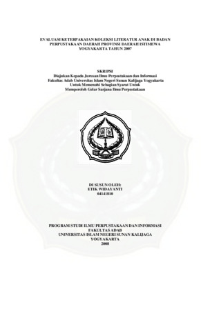 Etik Widayanti, NIM.: 04141810 (2008) EVALUASI KETERPAKAIAN KOLEKSI LITERATUR ANAK DI BADAN PERPUSTAKAAN DAERAH PROVINSI DAERAH ISTIMEWA YOGYAKARTA TAHUN 2007. Skripsi thesis, UIN SUNAN KALIJAGA YOGYAKARTA.