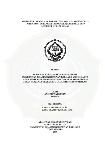 Anwar Wahyudin, NIM.: 01350938 (2008) MEMPEKERJAKAN ANAK DALAM UNDANG-UNDANG NOMOR 13 TAHUN 2003 TENTANG KETENAGAKERJAAN PASAL 68-69 MENURUT HUKUM ISLAM. Skripsi thesis, UIN SUNAN KALIJAGA YOGYAKARTA.