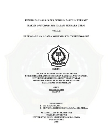 Ari Triyanto, NIM.: 01350747 (2008) PENERAPAN ASAS ULTRA PETITUM PARTIUM TERKAIT HAK EX OFFICIO HAKIM DALAM PERKARA CERAI TALAK DI PENGADILAN AGAMA YOGYAKARTA TAHUN 2006-2007. Skripsi thesis, UIN SUNAN KALIJAGA YOGYAKARTA.
