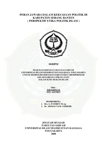 Edi Sofwan, NIM.: 04370027 (2008) PERAN JAWARA DALAM KEKUASAAN POLITIK KABUPATEN SERANG BANTEN ( PERSPEKTIF ETIKA POLITIK ISLAM ). Skripsi thesis, UIN SUNAN KALIJAGA YOGYAKARTA.