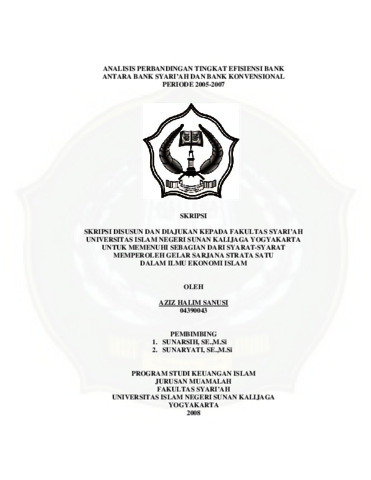Aziz Halim Sanusi, NIM.: 04390043 (2008) ANALISIS PERBANDINGAN TINGKAT EFISIENSI BANK ANTARA BANK SYARI’AH DAN BANK KONVENSIONAL PERIODE 2005-2007. Skripsi thesis, UIN SUNAN KALIJAGA YOGYAKARTA.