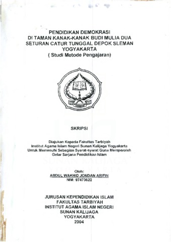 ABDUL WAKHID JONDAN ARIFIN, NIM. 97473622 (2004) PENDIDIKAN DEMOKRASI DI TAMAN KANAK-KANAK BUDI MULIA DUA SETURAN CATUR TUNGGAL DEPOK SLEMAN YOGYAKARTA (STUDI METODE PENGAJARAN). Skripsi thesis, UIN SUNAN KALIJAGA YOGYAKARTA.