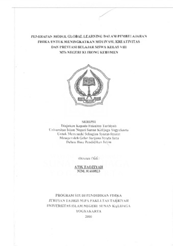ATIK FAOZIYAH, NIM. 01460823 (2006) PENERAPAN MODEL GLOBAL LEARNING DALAM PEMBELAJARAN FISIKA UNTUK MENINGKA TKAN MOTIV ASI, KREATIVITAS DAN PRESTASI BELAJAR SISWA KELAS VIII MTs NEGERI KLIRONG KEBUMEN. Skripsi thesis, UIN Sunan Kalijaga.