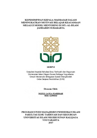 NUZUL LAYLA KARIMAH, NIM. 12490045 (2017) KEPEMIMPINAN KEPALA MADRASAH DALAM MENINGKATKAN MOTIVASI BELAJAR KEAGAMAAN MELALUI MODEL MENTORING DI MTs AL-ISLAM JAMSAREN SURAKARTA. Skripsi thesis, UIN SUNAN KALIJAGA YOGYAKARTA.