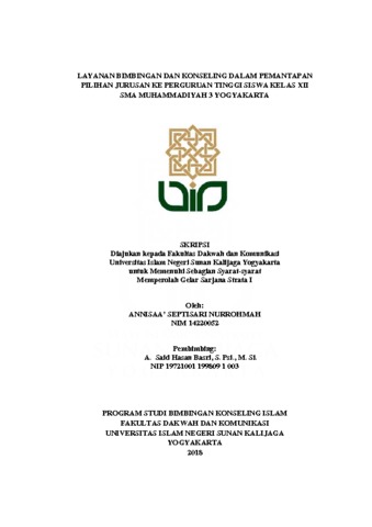 ANNISAA’ SEPTISARI NURROHMAH, NIM. 14220052 (2018) LAYANAN BIMBINGAN DAN KONSELING DALAM PEMANTAPAN PILIHAN JURUSAN KE PERGURUAN TINGGI SISWA KELAS XII SMA MUHAMMADIYAH 3 YOGYAKARTA. Skripsi thesis, UIN Sunan Kalijaga Yogyakarta.