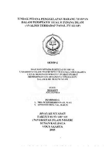 MlJHASIM, NIM:01370616 (2005) TINDAK PIDANA PENGGELAPAN BARANG TITIPAN DALAM PERSPEKTIF HUKUM PIDANA ISLAM (ANALISIS TERHADAP PASAL 375 KUHP). Skripsi thesis, UIN SUNAN KAIJAGA.